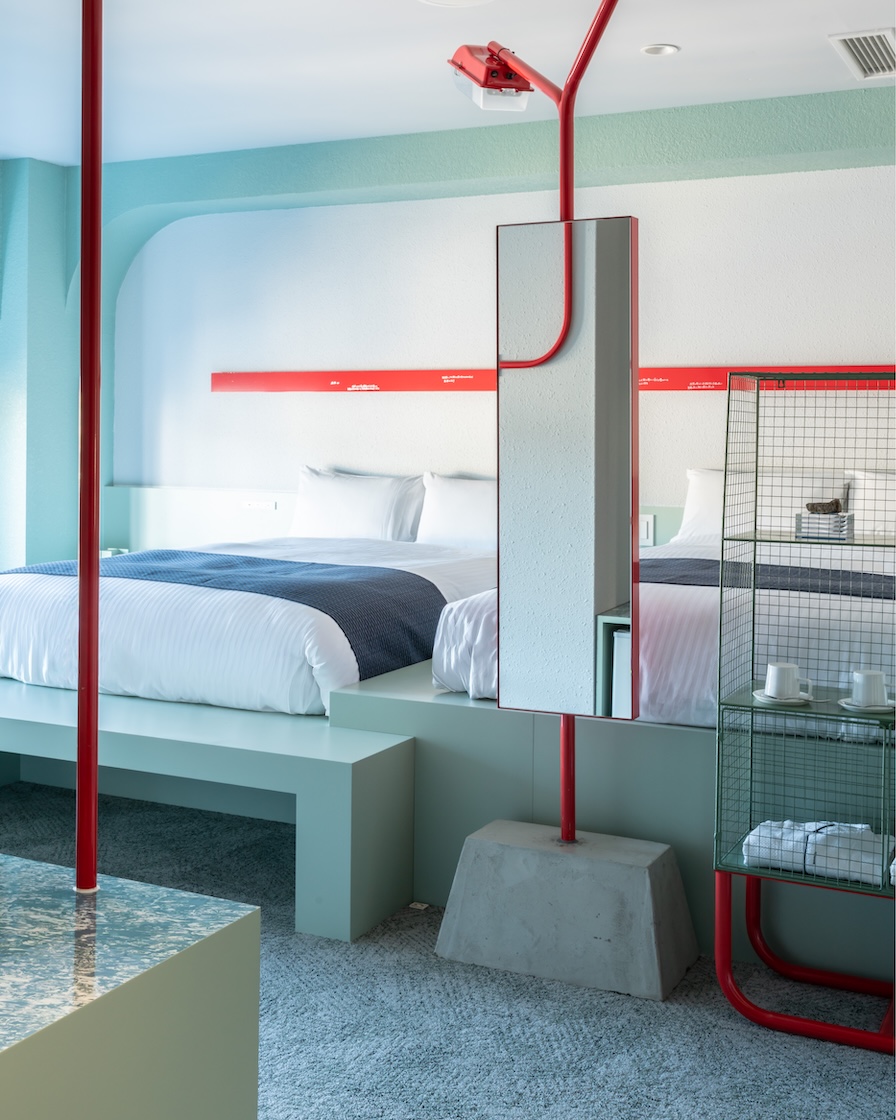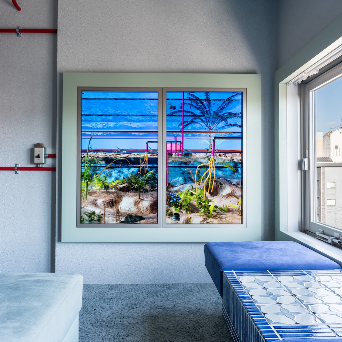 第19回ヴェネチア・ビエンナーレ国際建築展出品作家・藤倉麻子によるアートルーム。 緑色の段差がベッドとなり、タイルで装飾されたベンチが無造作に置かれている。赤いパイプが家具として立ち上がり、街灯が夜を照らす。 窓の向こうには見慣れないどこかの植生が見える。やわらかい採光の中で、遠くに感じる太陽を座って受け取る。 移動と静止、内と外、昼と夜の間を往復する。